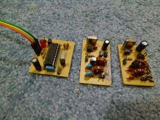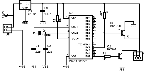 CW TX termometar je termometar baziran na PIC1684 i DS1820 senzoru. Radi na taj način da mjeri temperaturu sa rezolucijom od 0,5 stupnjeva i kao takvu pretvara je u CW. Na izlaz tranzistora Q2 niže u shemi može se staviti oscilatorna zujalica i imamo temperaturu u CW formatu koja se mjeri u intervalima od oko 5 sekundi ( podešeno softverski). Ako se izlaz spoji na CW predajnik na slici 2. dobivamo mali odašiljač od oko 150mW na 18 MHz. Frekvencija je sad ovisna o kristalu. Senzor mora biti DS1820 ili DS18S20. DS18B20 neće dobro raditi! Ovdje možete skinuti sve što je potrebno u paketu od pločica, shema i softvera za PIC. Pločice i sheme su rađene u EAGLE-u: link Inače moj radi na 18.434 MHz već 8 godina bez prestanka. Antena je obična inverted v sa vrhom na 6 metara, nije baš najbolje podešena ali možda netko čuje!!! Trebam još napomenuti da mjerenje radi na taj način da ukoliko je negativna temperatura kuca slovo T umjeto minusa, a umjesto zareza decimale slovo E. To je napravljeno zbog jednostavnosti. Na primjer -2,5 stupnjeva zvuči kao T02E5C i tako redom... JP1 konektor napajanje, JP2 je key out. |