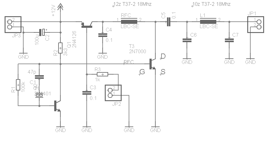 RF transformatori su 2 komada T37-2, a žica je oko 0.4 mm. C6-7 su 82 pf za 18 MHz. Napajanje transmitera je 9 - 15 V. JP2 konektor je key in. |